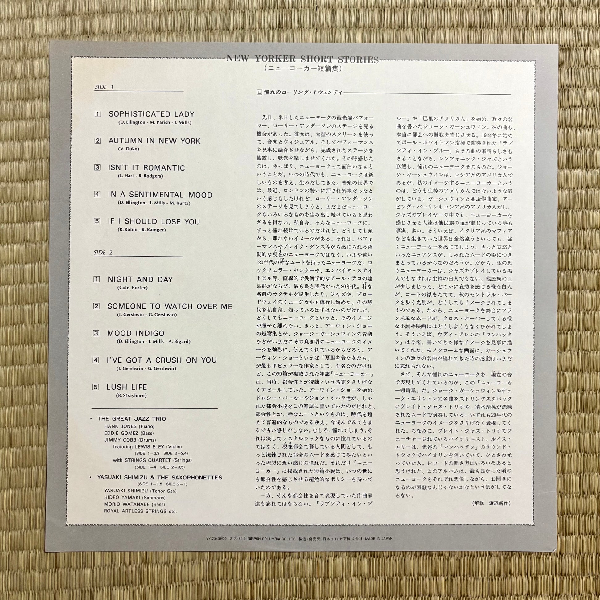 Jazz compilation released by Nippon Columbia in 1984, featuring three tracks from the classic Autumn in Beijing by Yasuo Shimizu & The Saxophonettes (1983), four tracks from The Club New Yorker by The Great Jazz Trio feat. Lewis Eley, and three tracks originally included on the Interface label sampler. Despite being a compilation project, the album flows with surprising cohesion — highlighted above all by the outstanding contributions from Shimizu & The Saxophonettes.