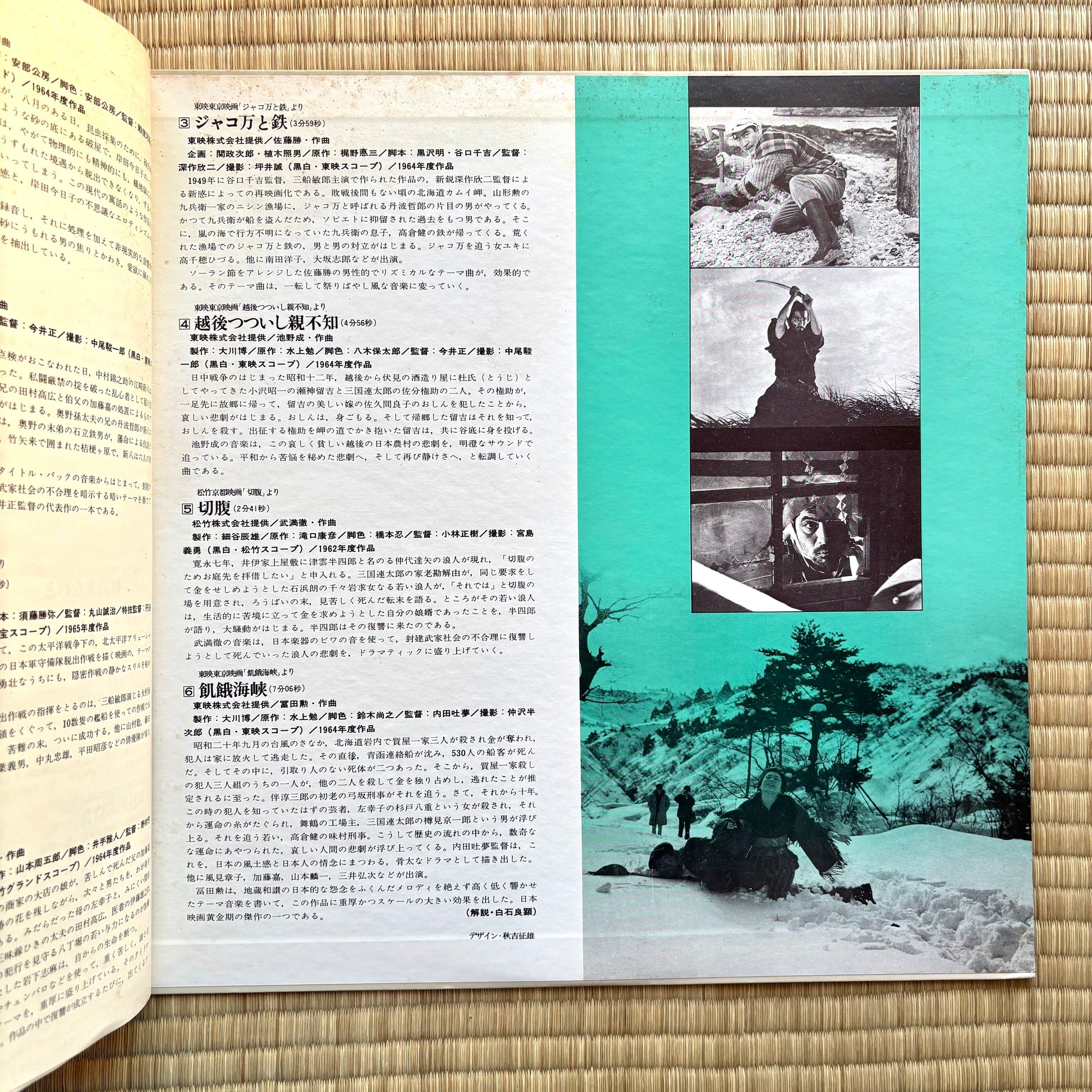 Unexpectedly heavy Japanese cinema theme compilation. Not a flat, modern re-recording – this King 2LP has real 70s room air, tape hiss, and wide stereo that sometimes feels almost psychedelic. Strings and percussion bloom in the room, and when the brass hits (esp. on Yojimbo/Shinobi no Mono) you get that slightly overdriven, almost noise-like texture collectors love. This is why people buy original Japanese pressings, not later CDs.