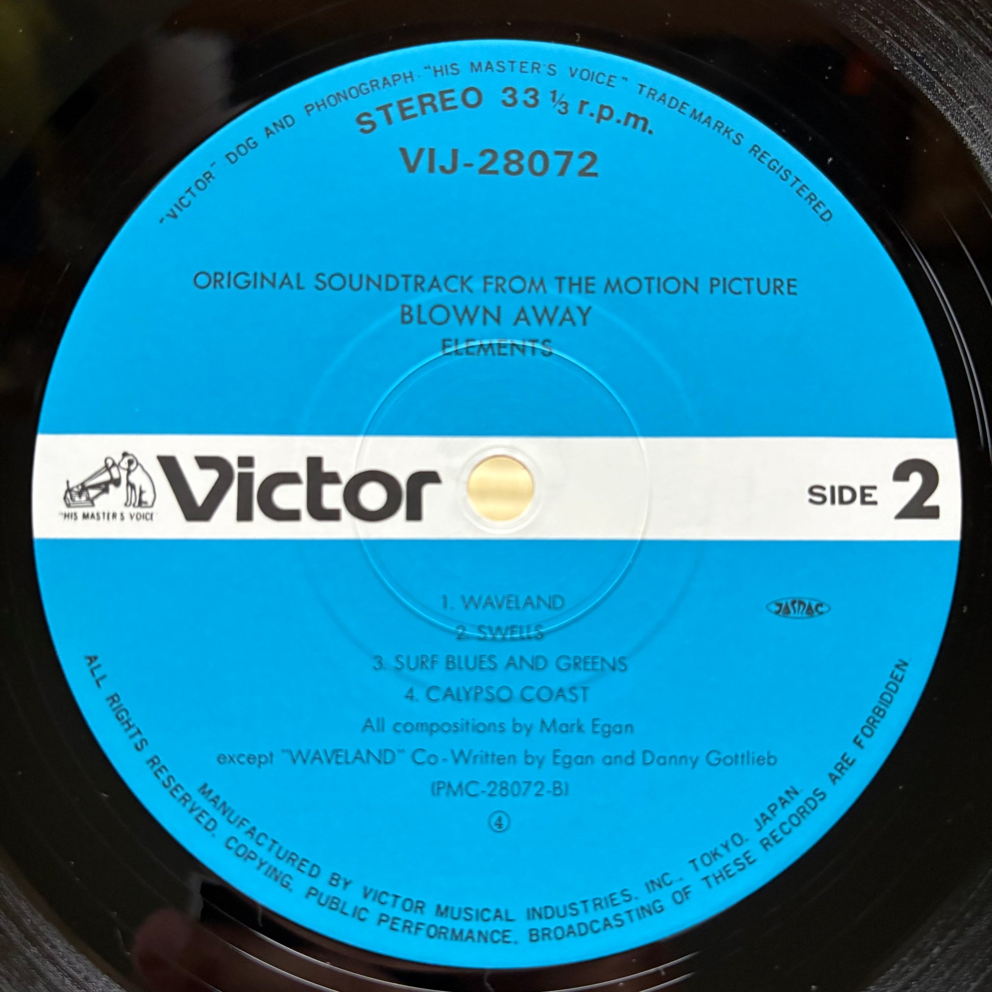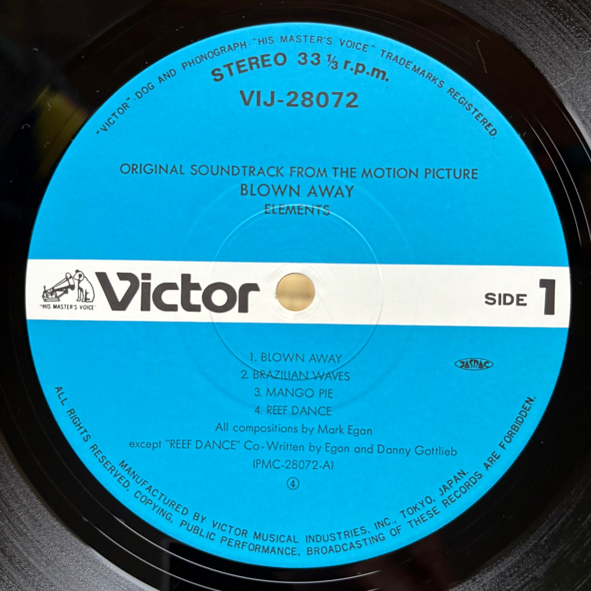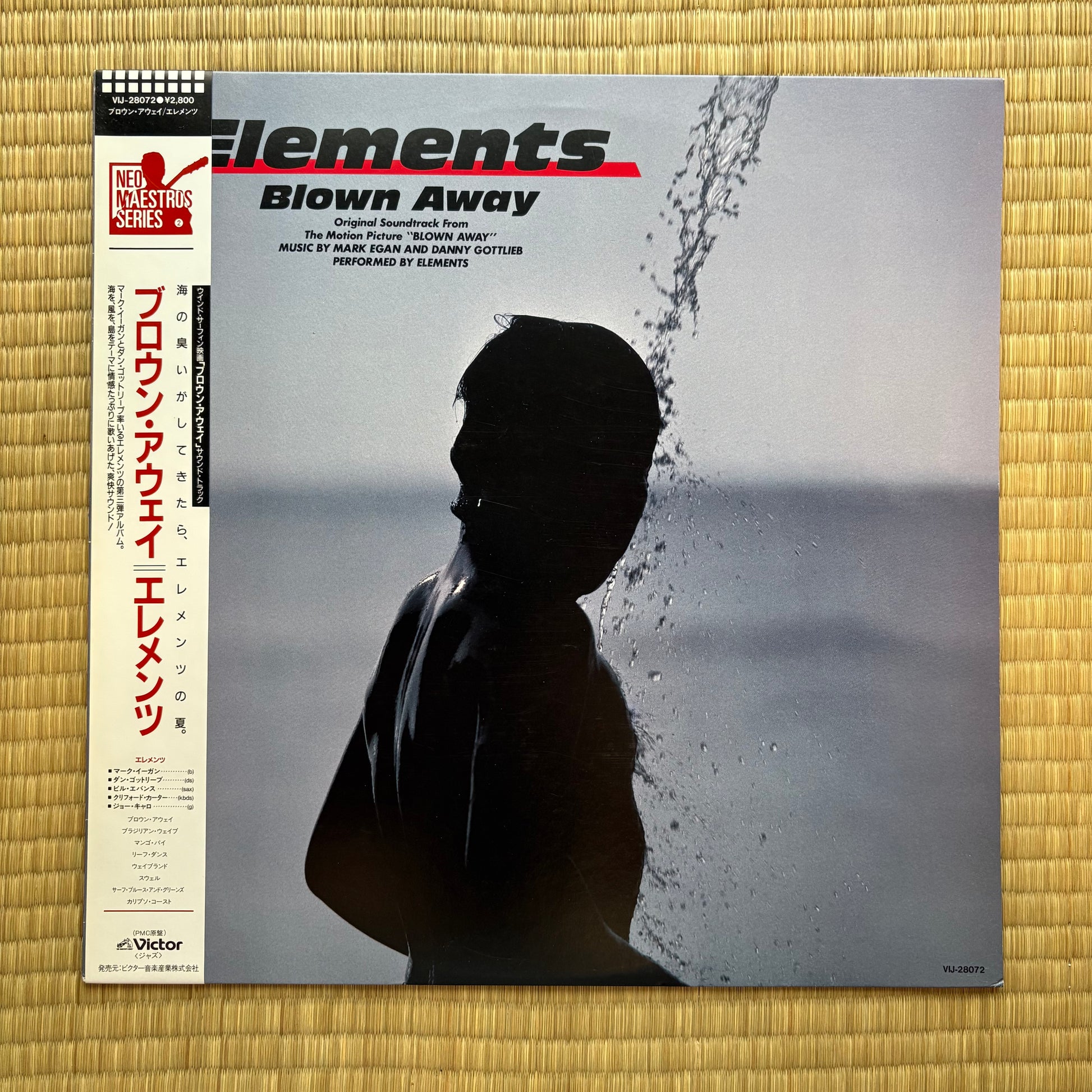 Elements — Blown Away (1986, Victor VIJ-28072, Japan) is the soundtrack to the wind-surfing film, performed by Mark Egan (b) and Danny Gottlieb (ds) of the Pat Metheny Group with Bill Evans (sax) and Clifford Carter (keys). This Japan-only cover edition (obi/insert) differs from the US/Europe Passport Jazz PJ 88029 artwork. Highlights include Reef Dance and Swells—polished, breezy electric fusion ideal for City Pop/J-fusion fans.