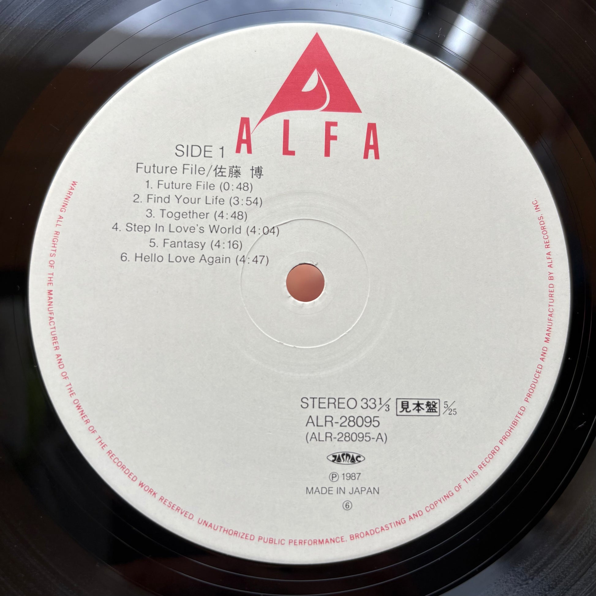 Released May 25, 1987 on Alfa, Future File is Hiroshi Sato’s seventh studio album—self-produced/arranged, with West-Coast firepower across the rhythm section: John “JR” Robinson (drums), Jun Aoyama (drums), Nathan East and Bobby Watson (bass), Paul Jackson Jr. and Yuji Toriyama (guitars), plus Lynn Davis on vocals. The set balances radio-polished pop (“Find Your Life,” “Together”) with deeper club-leaning cuts (“Fly To You,” “Funky Multi”), giving DJs clean count-ins and steady mid-tempo grids. First issues appeared on LP/CD in Japan (e.g., ALR-28095 / 32XA-158), later reissued with bonus mixes (“Sweet Inspiration” extended versions).