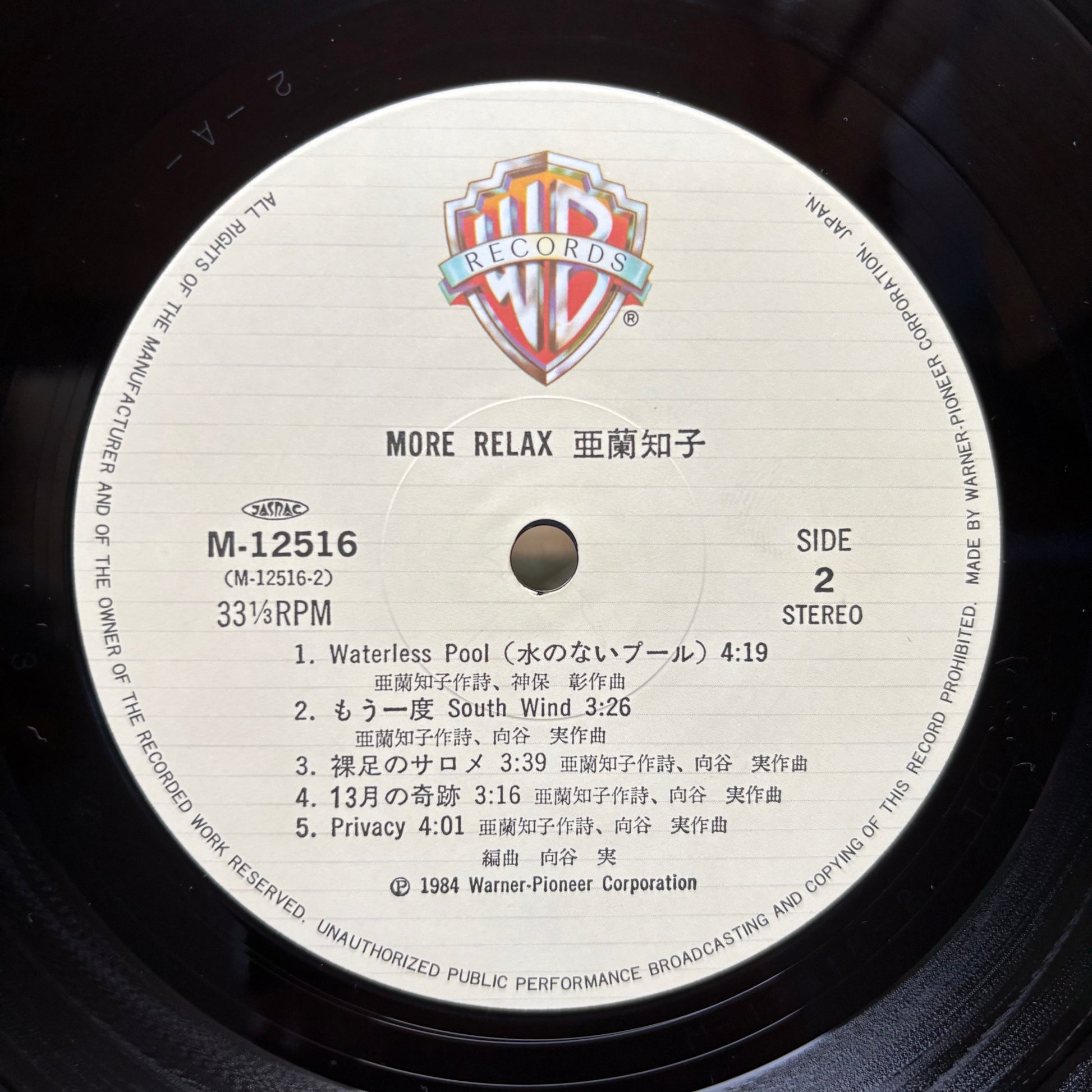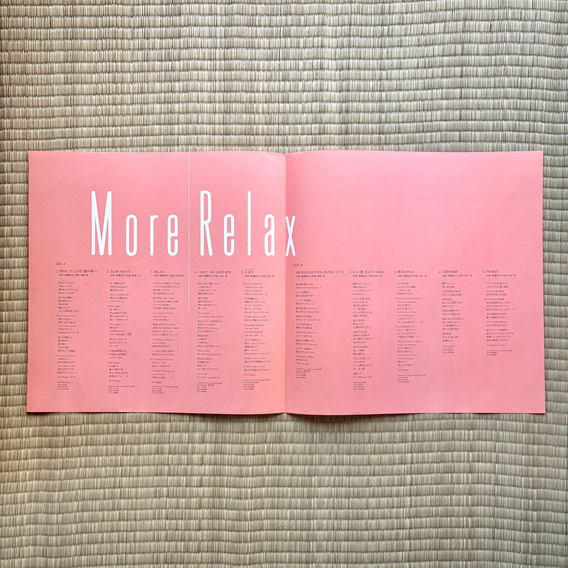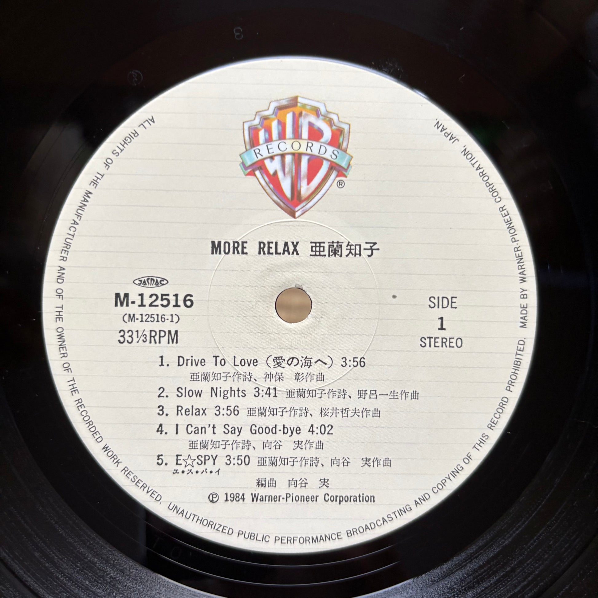 Released May 28, 1984, on Warner-Pioneer/Warner Bros. (cat. M-12516), More Relax is Tomoko Aran’s fourth LP, produced/arranged by Casiopea’s Minoru Mukaiya. The set pairs radio-polished pop with coastal, mid-tempo flows—tight rhythm work from Casiopea mates Tetsuo Sakurai (bass) and Akira Jimbo (drums), plus guests like Makoto Matsushita, giving the album its sleek city-funk sheen. Standouts include the airy “Waterless Pool,” the neon bounce of “E☆SPY,” and the title-suggesting “Relax,” with clean count-ins and steady grids that DJs/Selectors love.