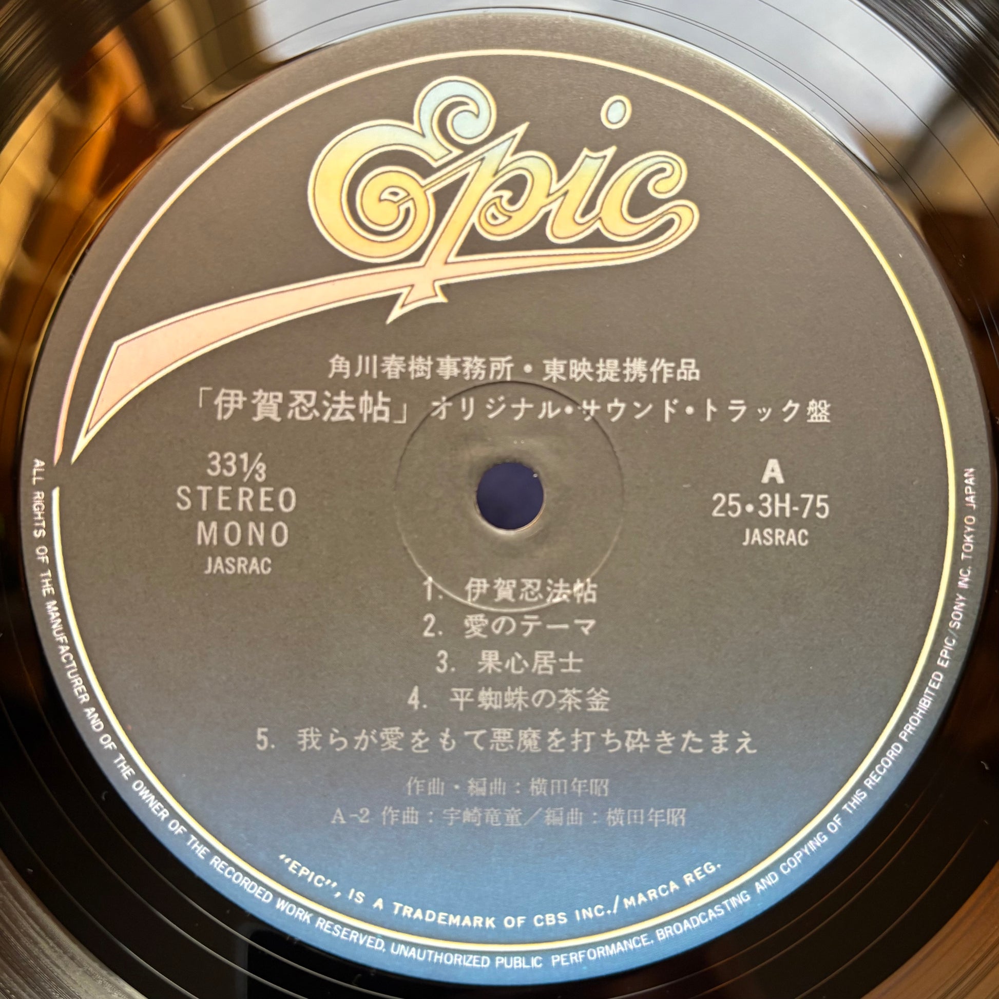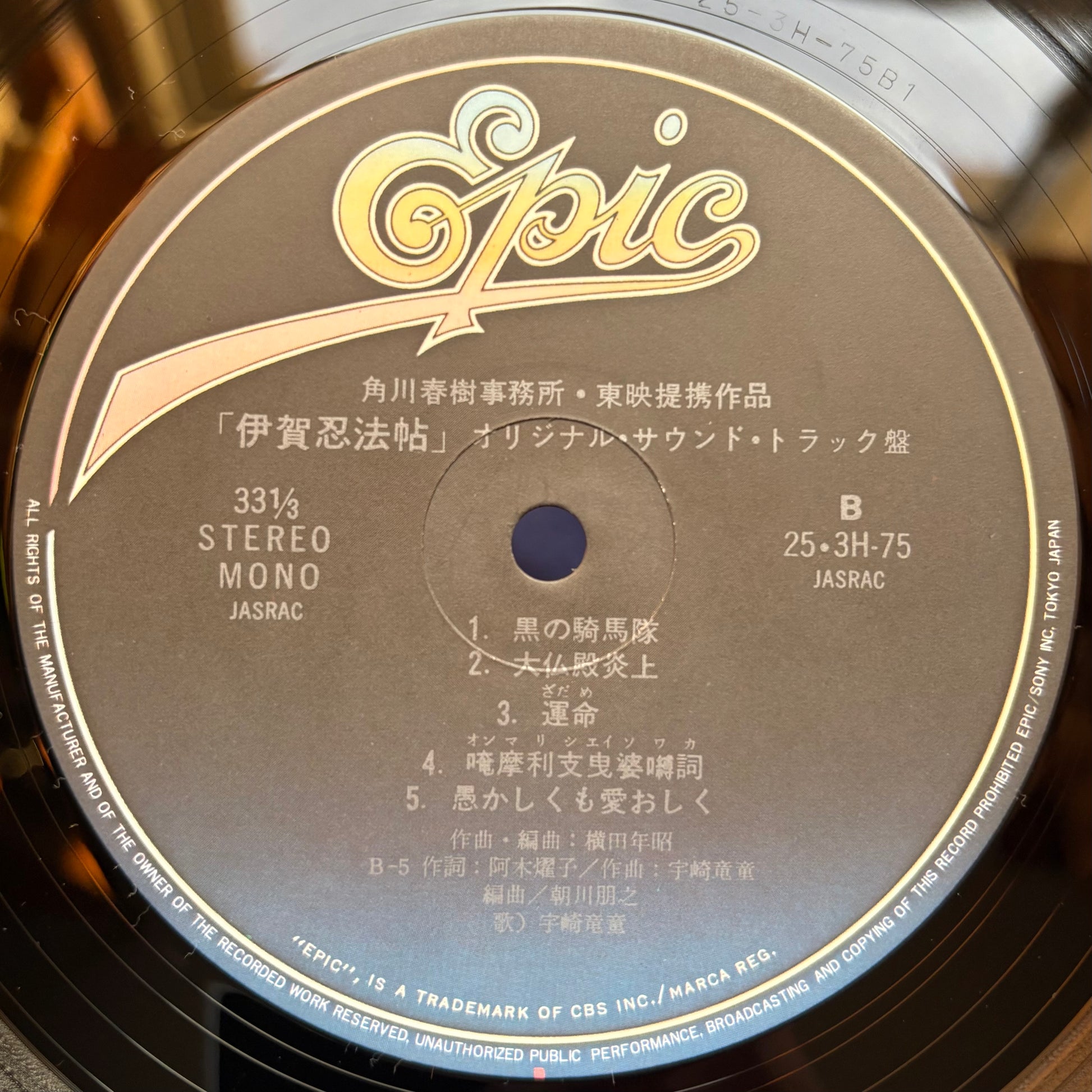 This is one of those early-80s Japanese movie soundtracks that can be sold both to ninja/kadokawa fans and to groove diggers. Side A gives you the Japanese/colorful cues (“Iga Nimpoh-Cho,” “Kashin Koji”), Side B suddenly goes into driving fusion (“Kuro no Kiba-tai”) and tense action (“Daibutsuden Enjo”), plus the proper vocal. When listing, write: “1982 Japan original / Epic 25•3H-75 / music by Toshiaki Yokota / feat. shakuhachi & fusion action cues.” That tells overseas buyers it’s not just BGM, it has real band parts.