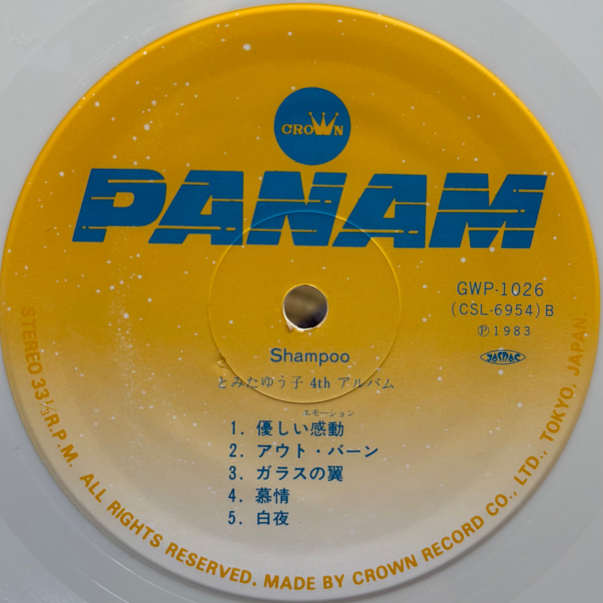 Released in 1983 on Panam as a white-vinyl LP, Shampoo brings together synth-pop, new wave and soft city pop with Yuko Tomita’s gentle, almost whispery vocals on top. A-side highlights like “Dance Dance Dance” and the title track “Shampoo” lean into urban middle boogie and 80s disco textures, while B-side cuts such as “Glass no Tsubasa” and “Byakuya” drift into more balearic, light-mellow territory. Clean drum programming, simple synth bass vamps and open chord sections make this a very sample-friendly record for beatmakers, and for DJs it slips naturally into modern city pop, Japanese boogie or leftfield disco sets without losing its soft, emotional J-POP core.